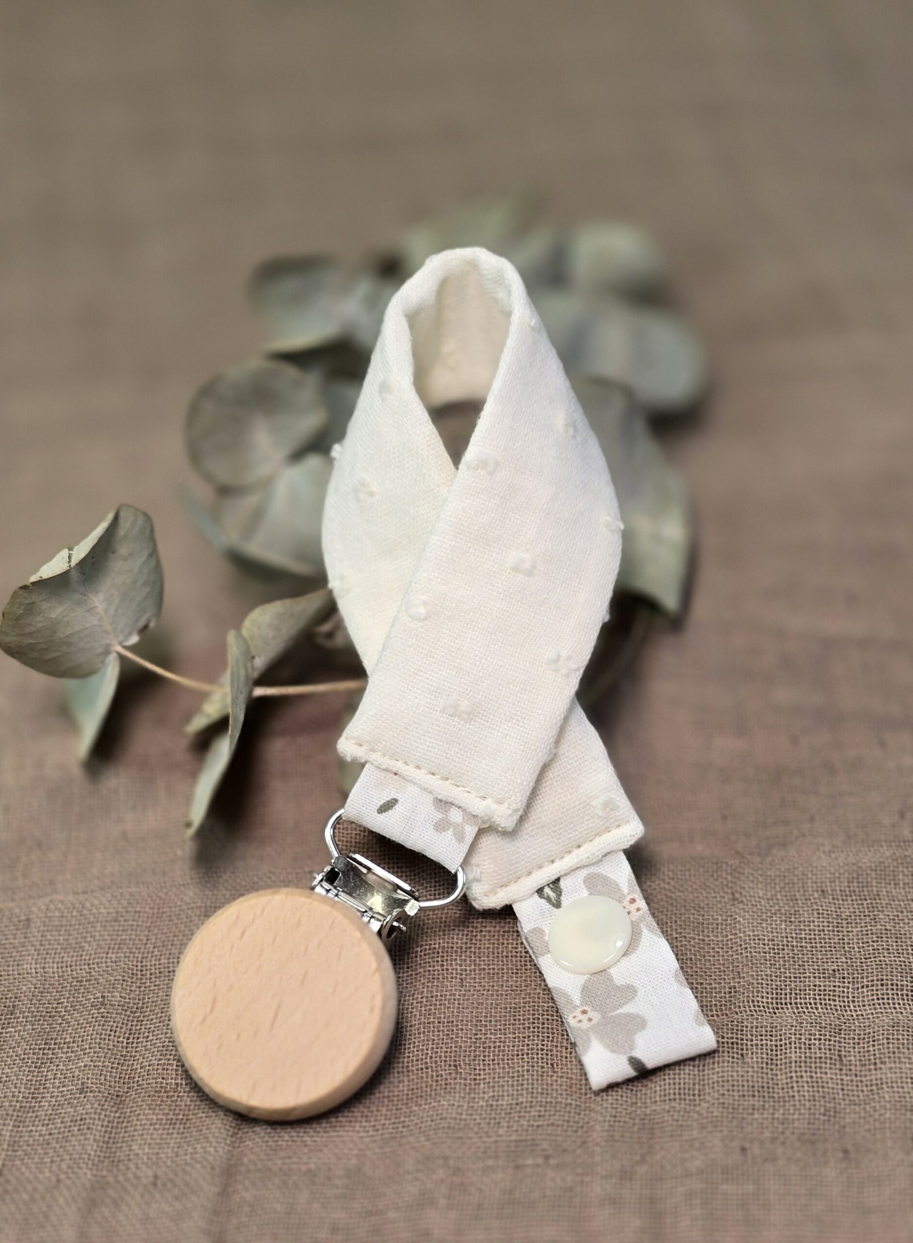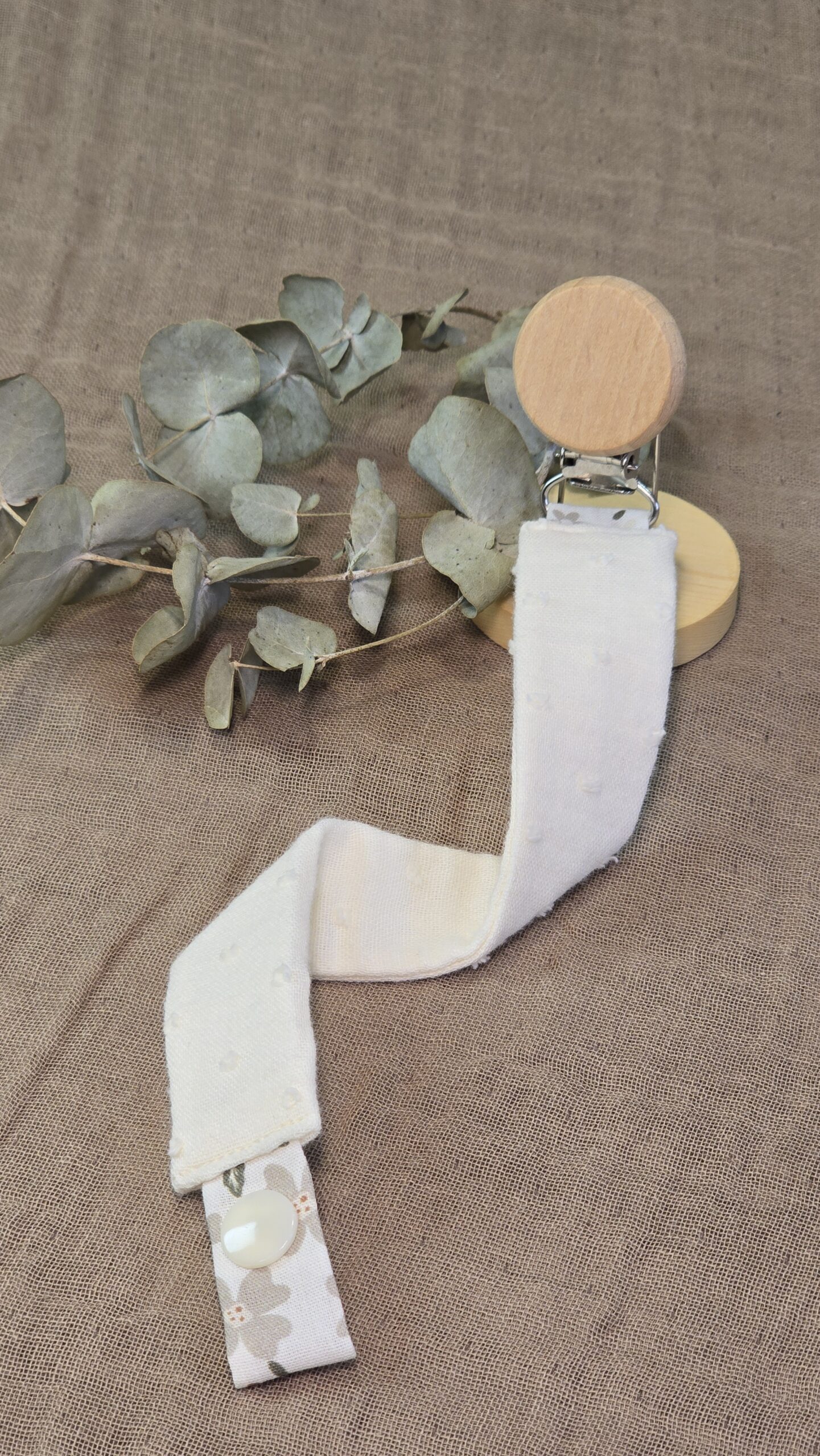 Chupetero de tela y pinza en madera de haya natural ideal para que tu bebé tenga siempre cerca su chupete.