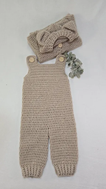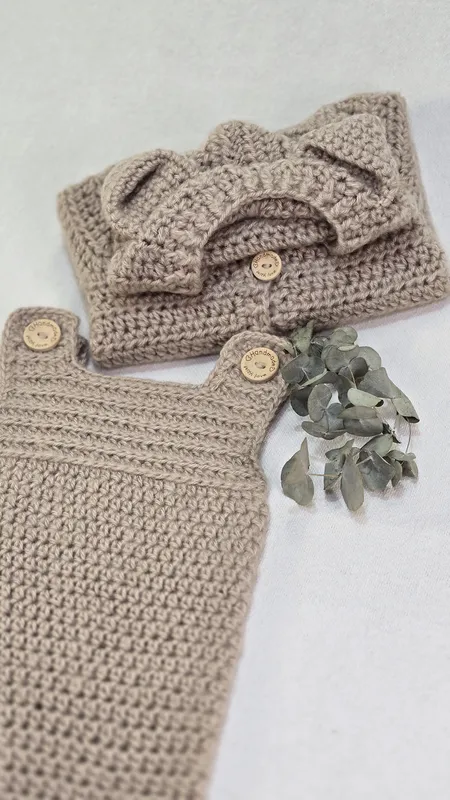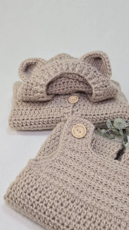 • Conjunto de chaqueta con capucha y orejitas de oso. Peto de pantalón largo. Ambas piezas con botonadura en madera.