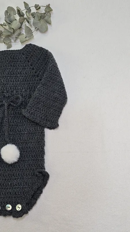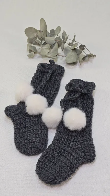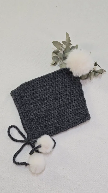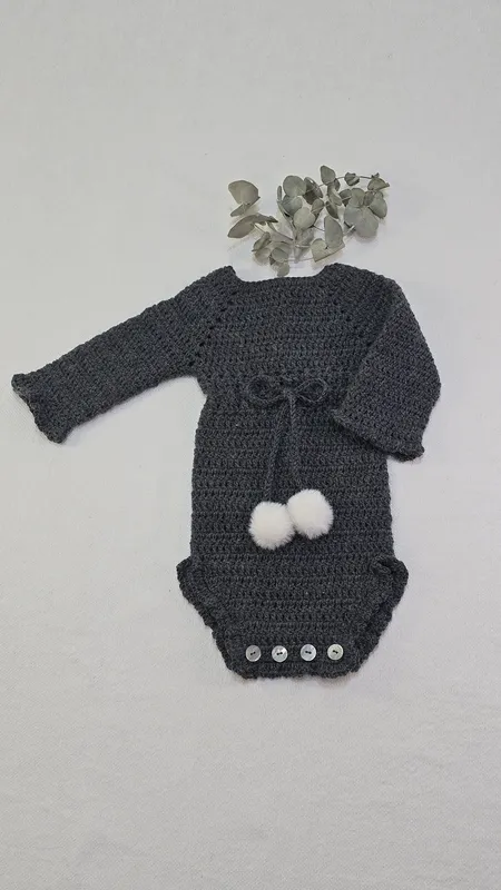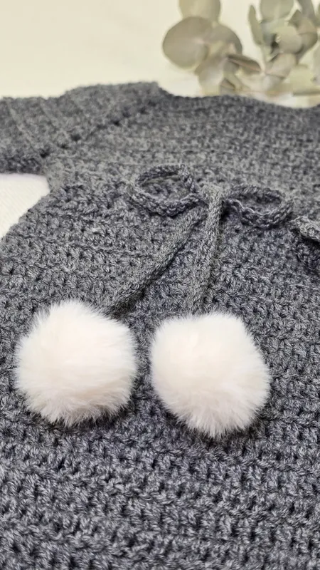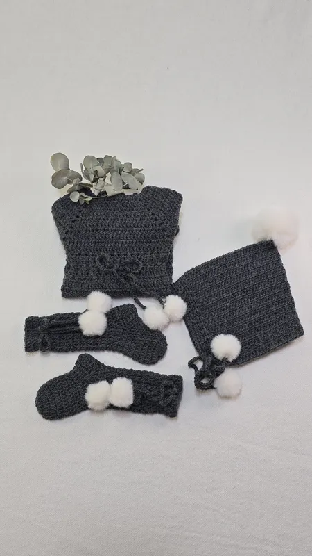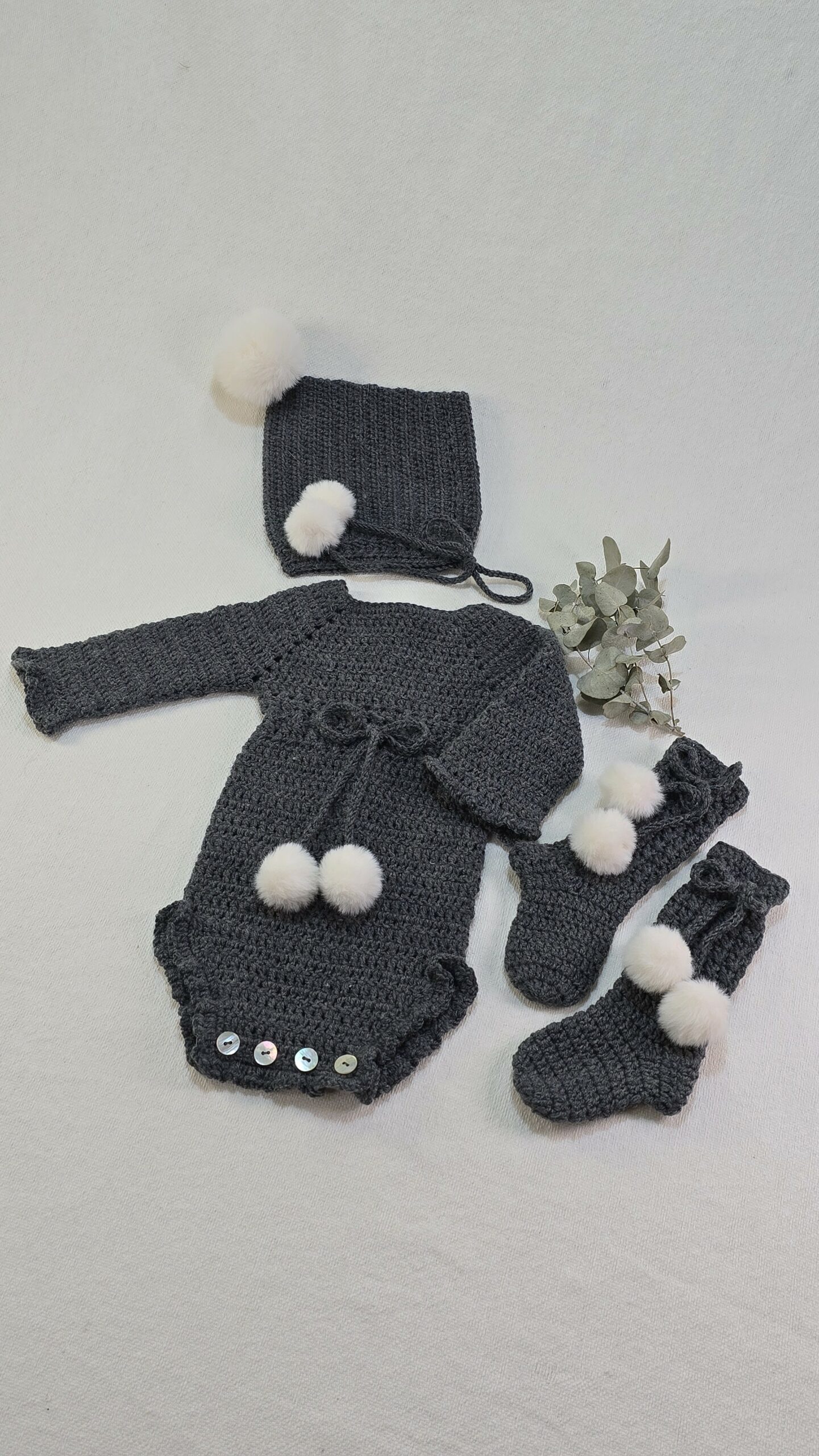 • Conjunto de pelele, calcetines largos y capota todo ajustable con cordón y decorado con pompones.