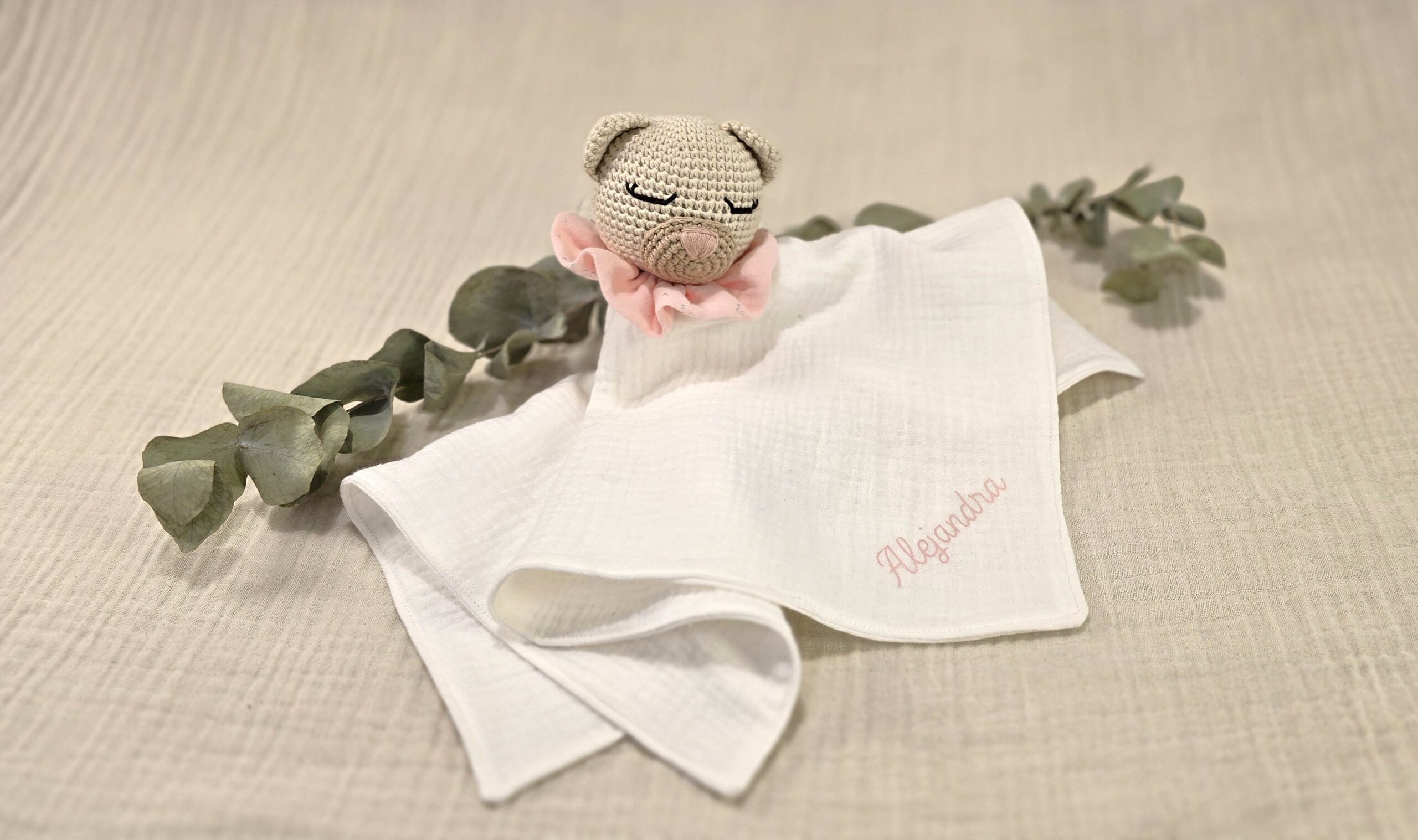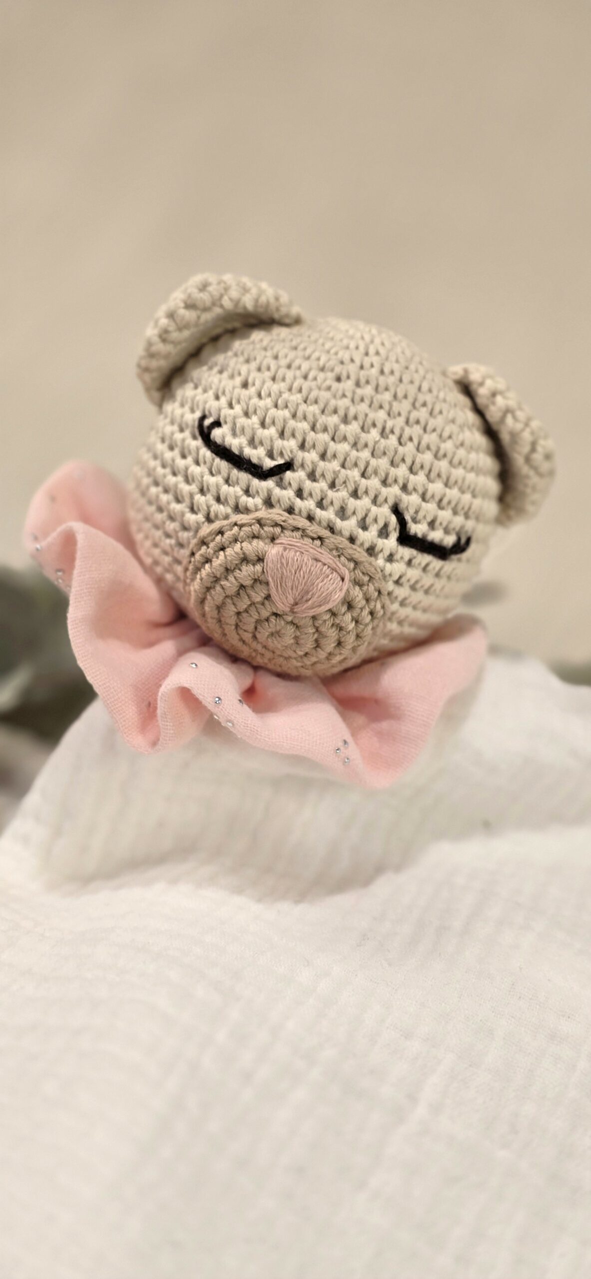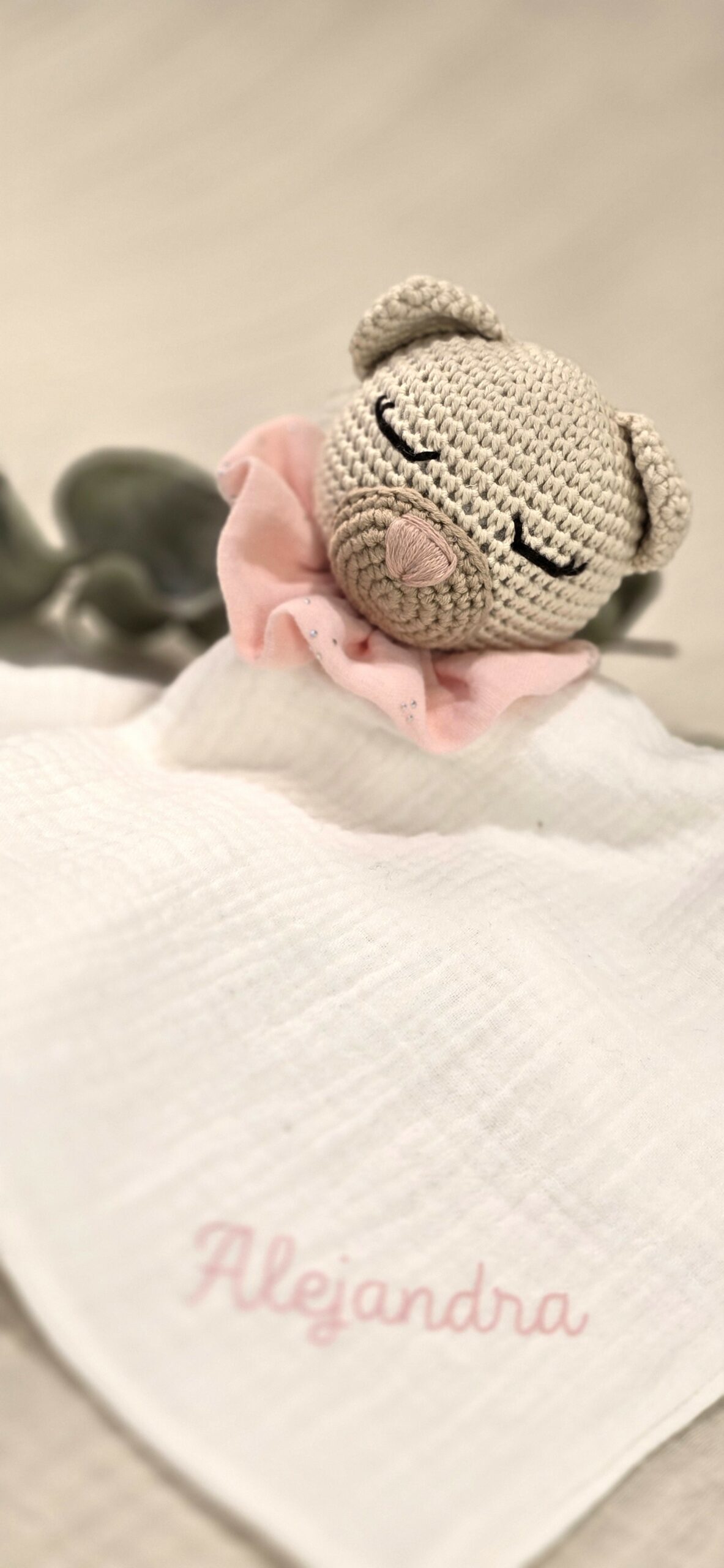 Hecho a mano con cabeza de animalitos en crochet y muselina.