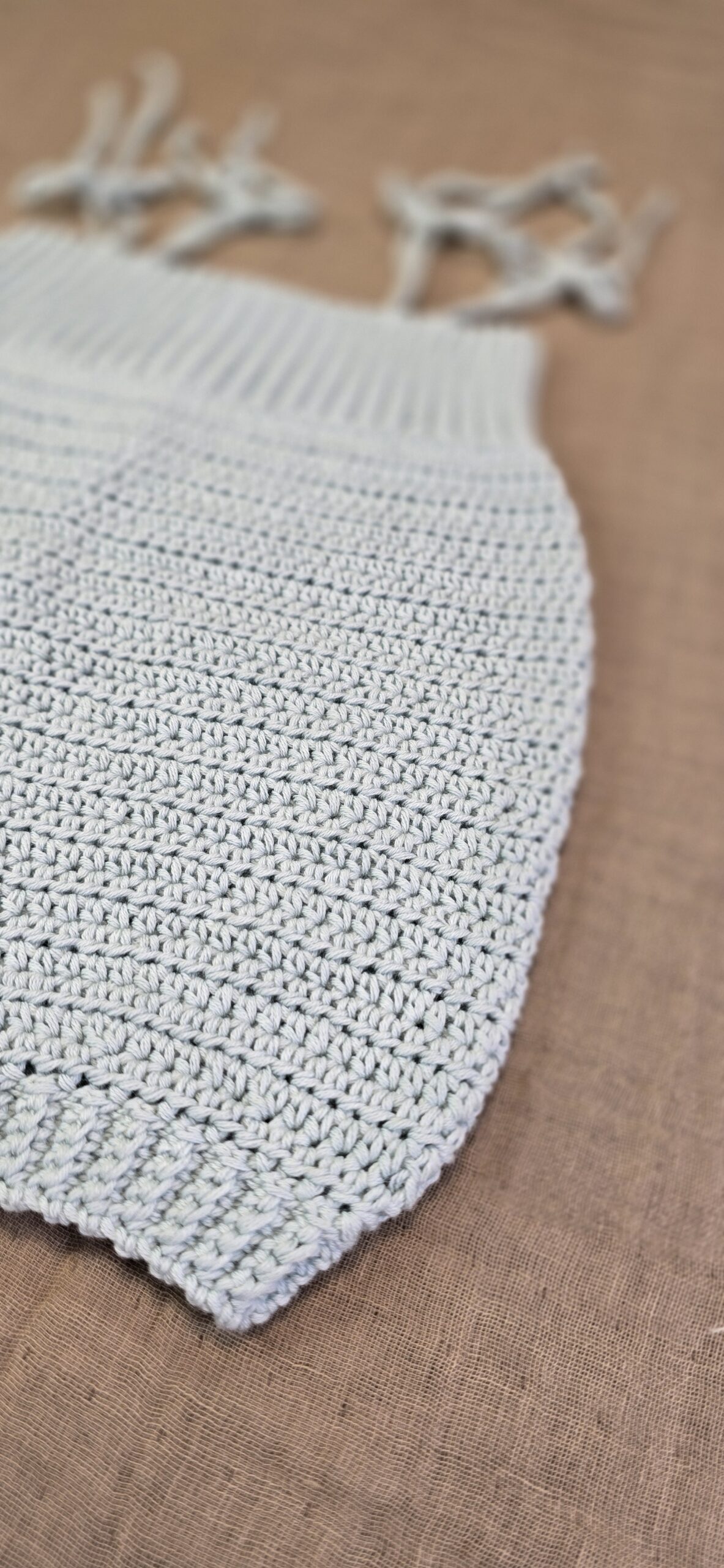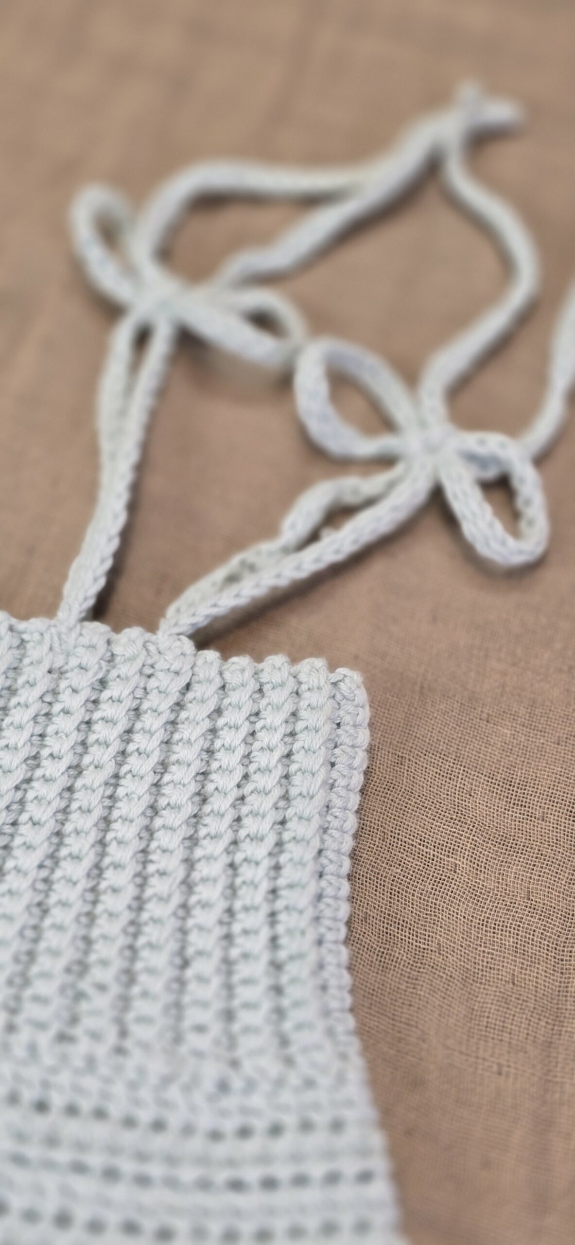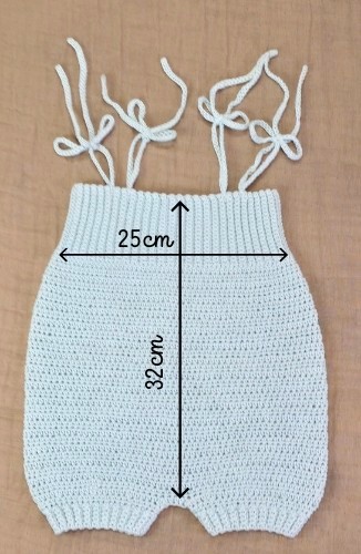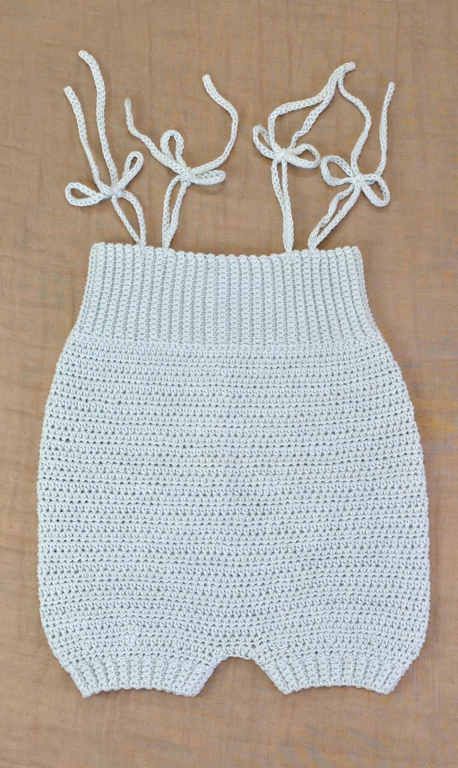 Pelele tejido a crochet, bombacho con canesú en punto elástico y tirantes regulables.