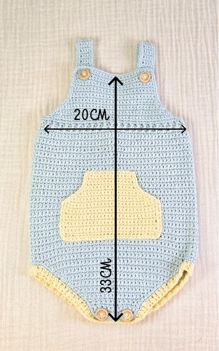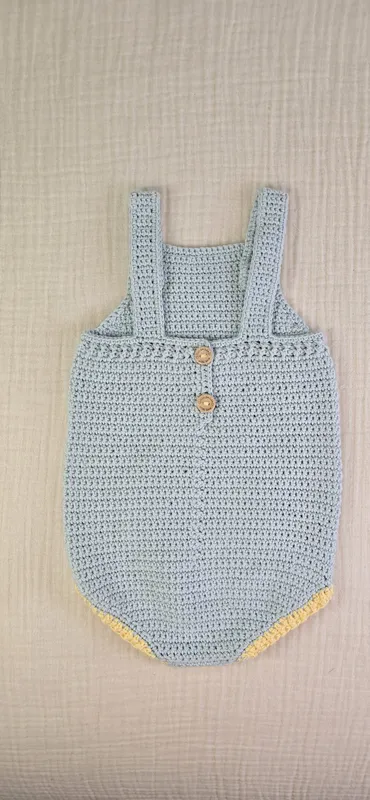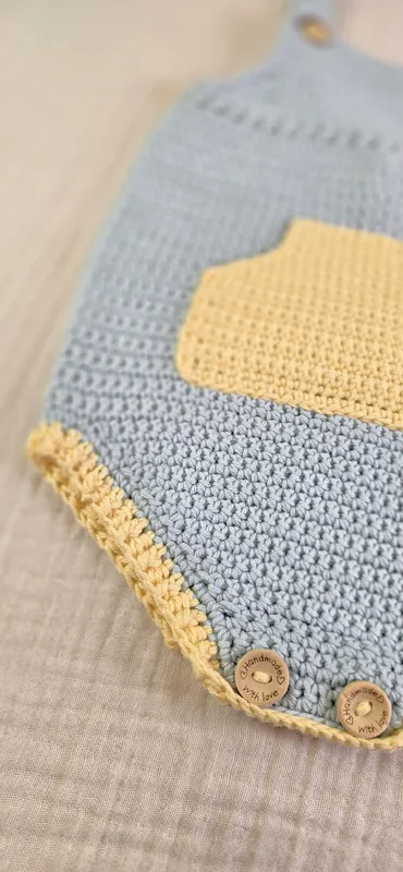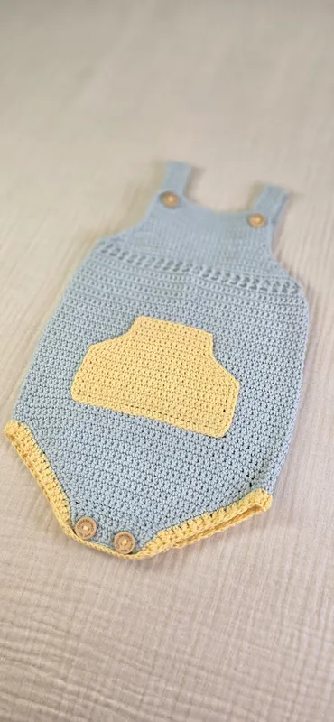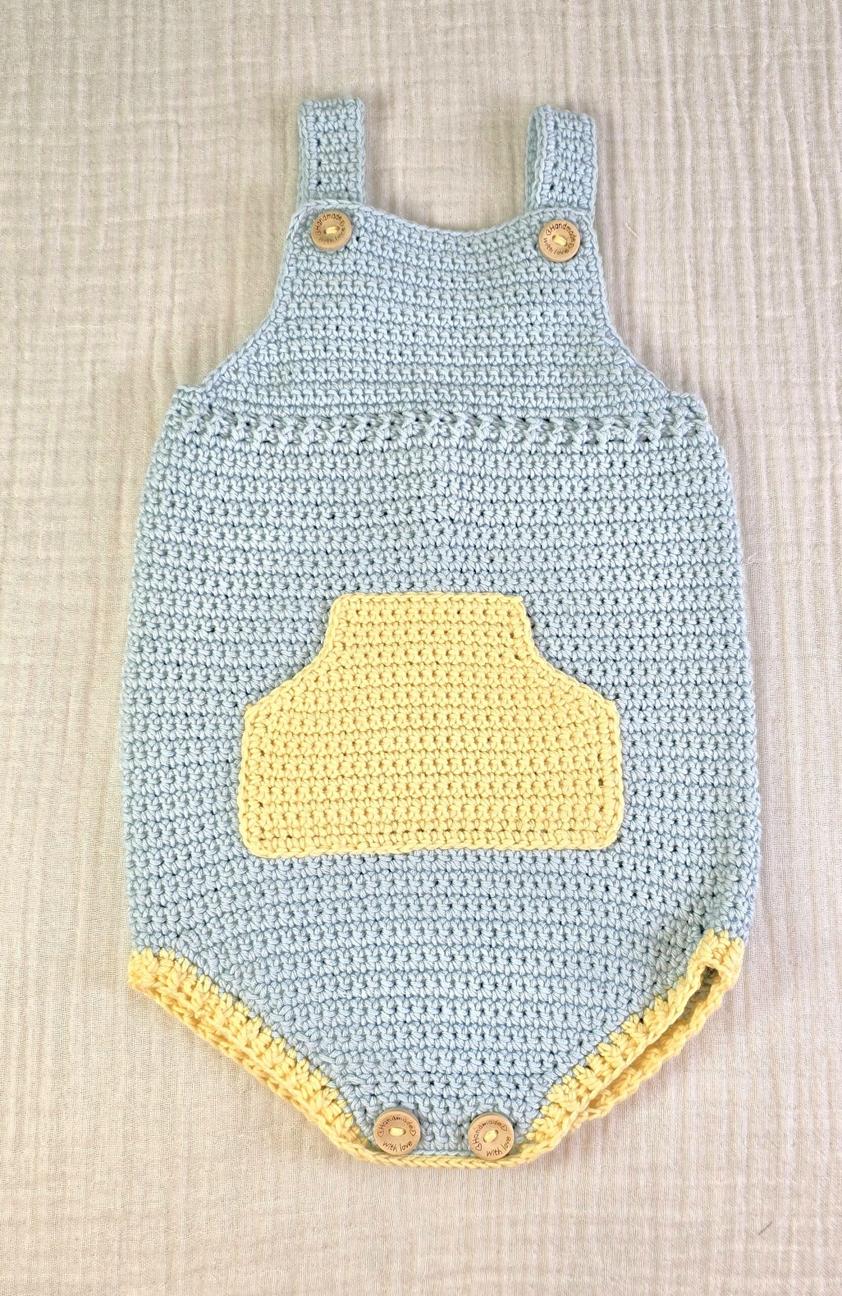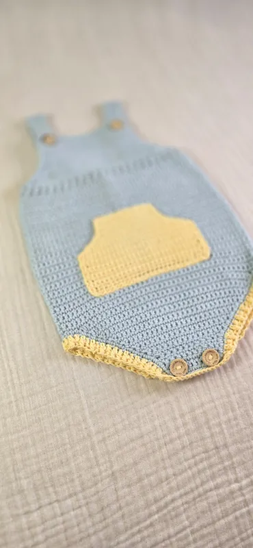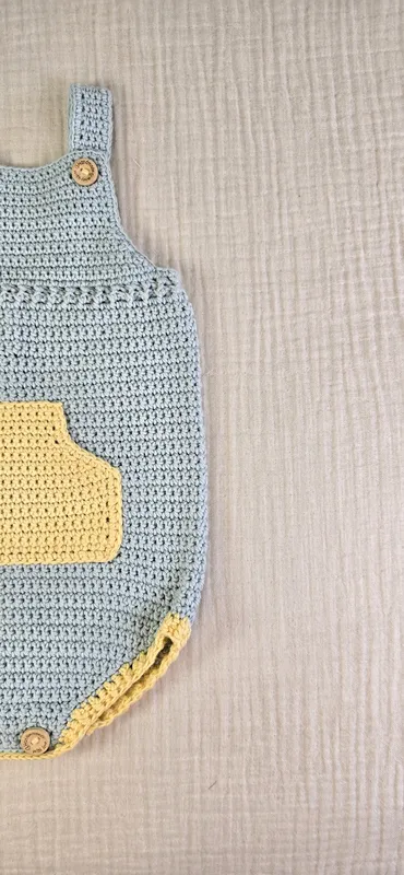 Pelele tejido a crochet con bolsillo y tirantes regulables.