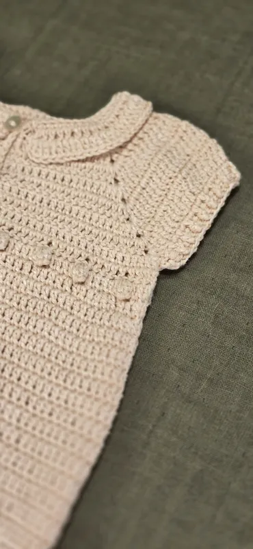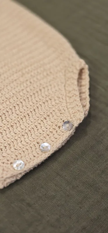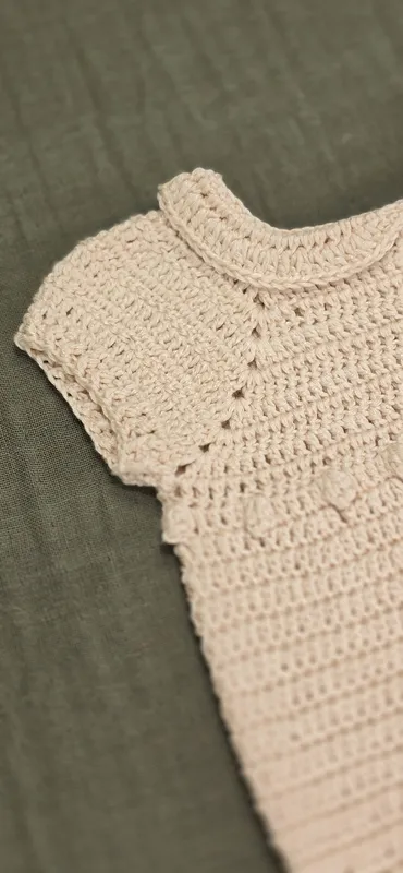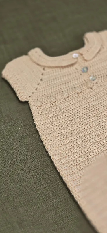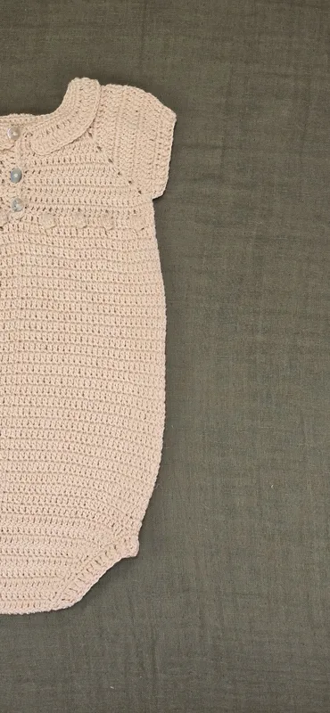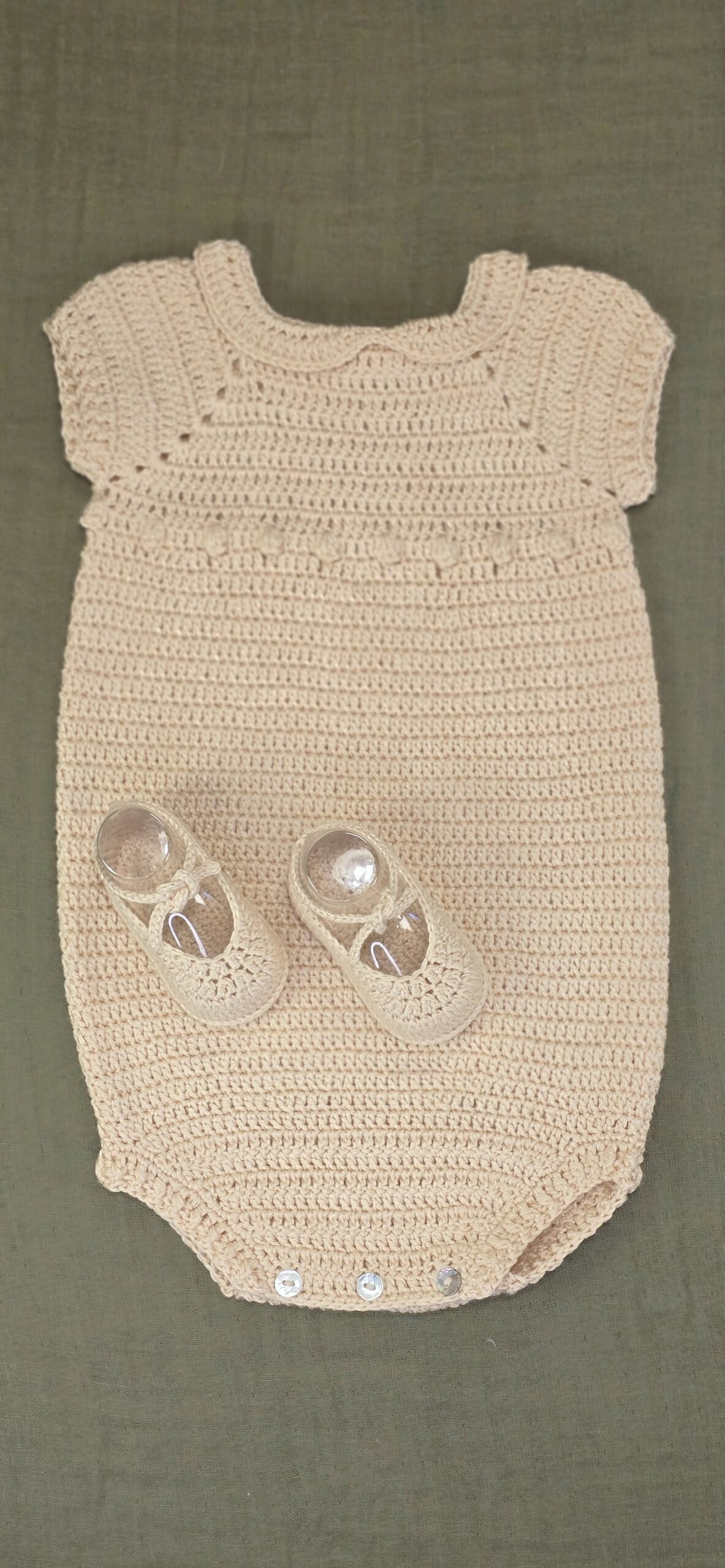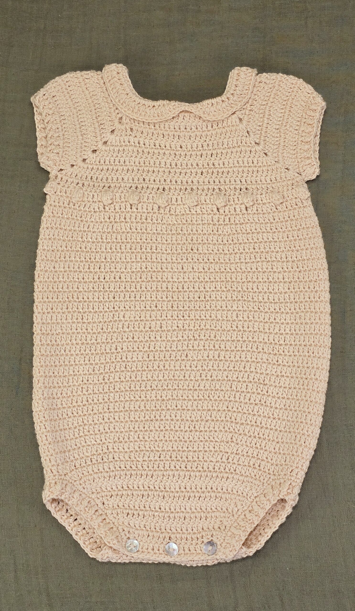 Pelele tejido a  crochet, con detalles en punto garbanzo y cuello bebé , abotonado en la espalda y entrepierna con botones de nacar.