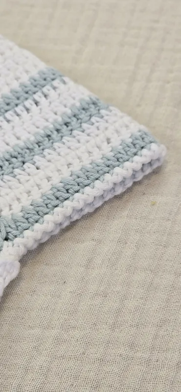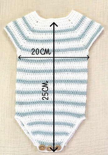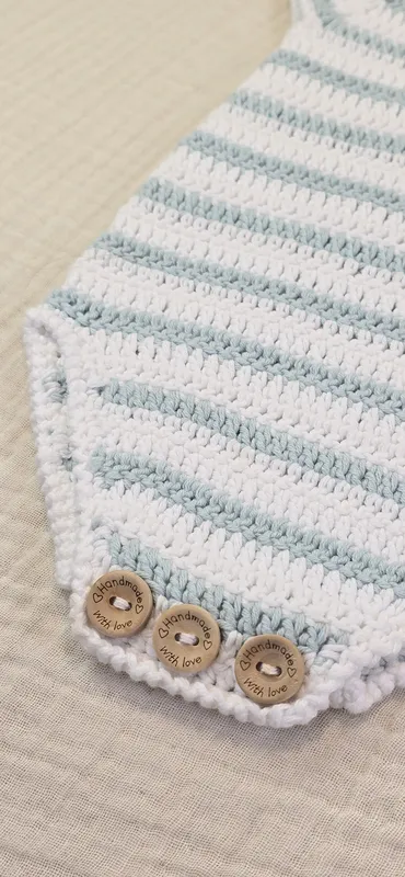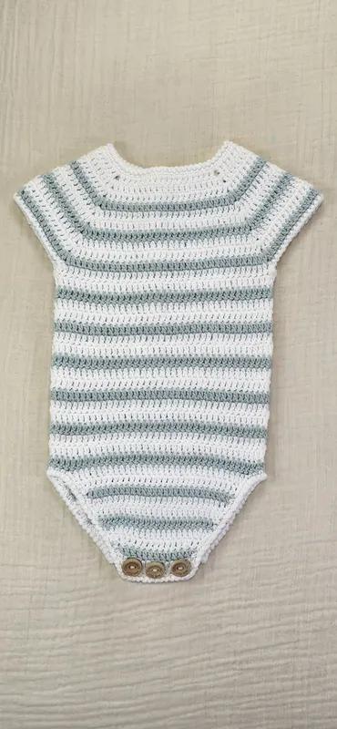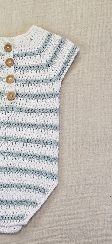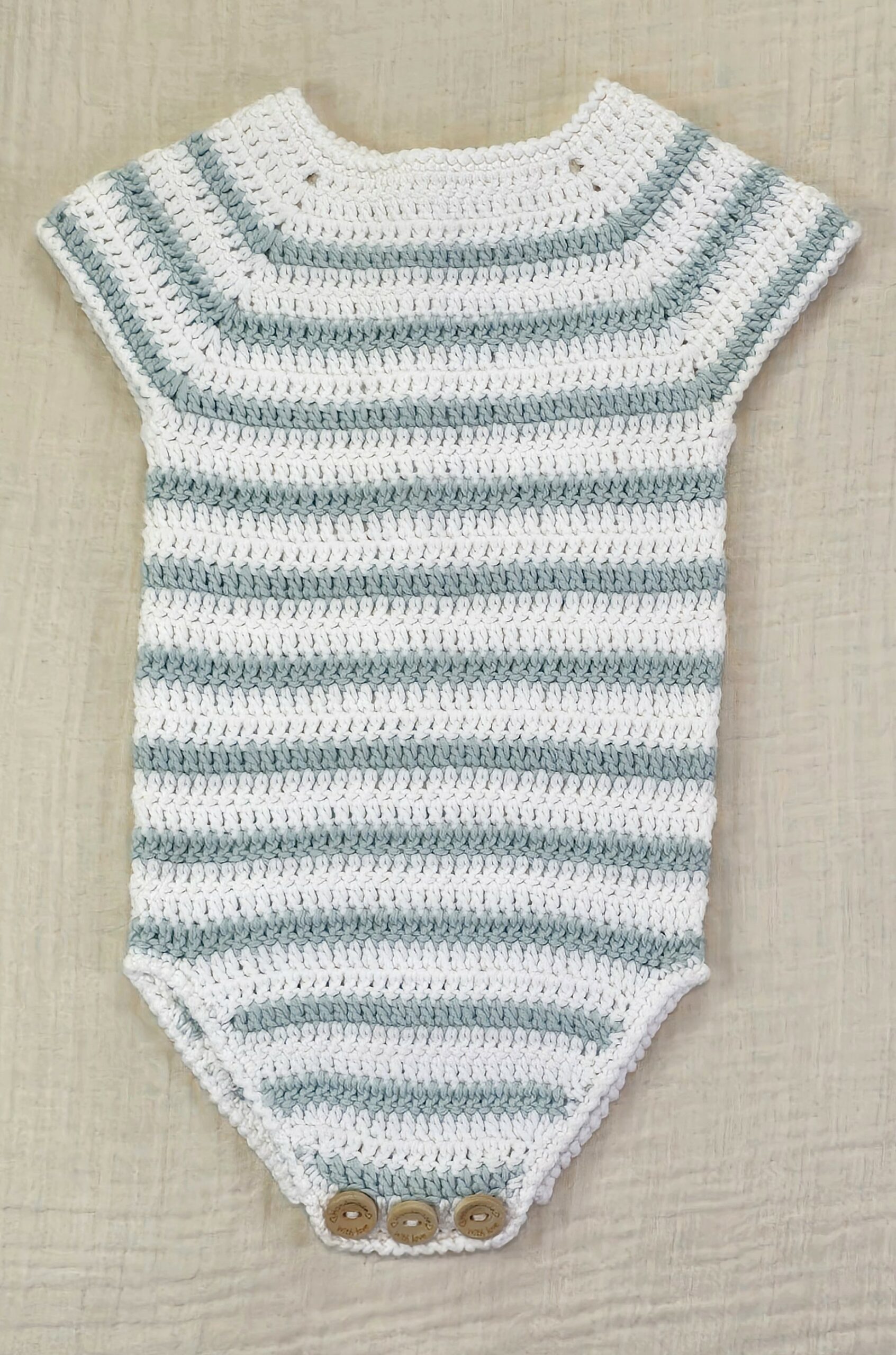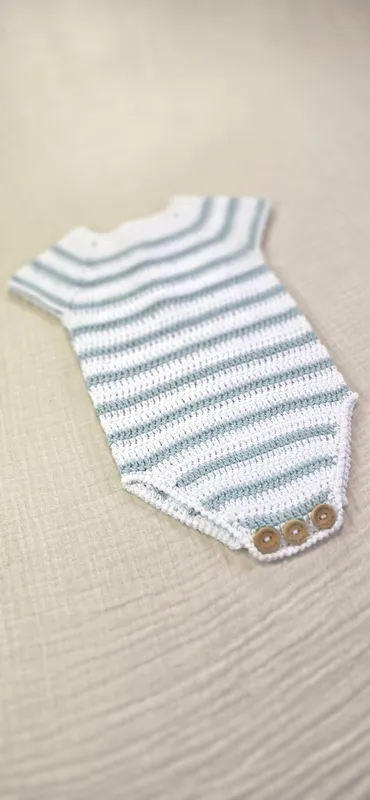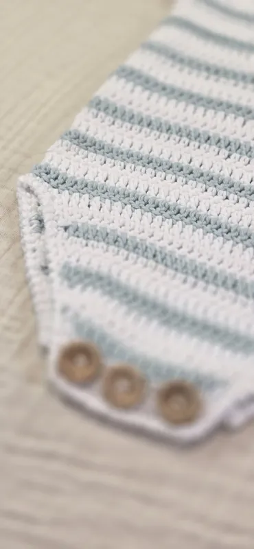 Pelele tejido a crochet, con cierre en la entrepierna y la espalda con botones en madera natural.