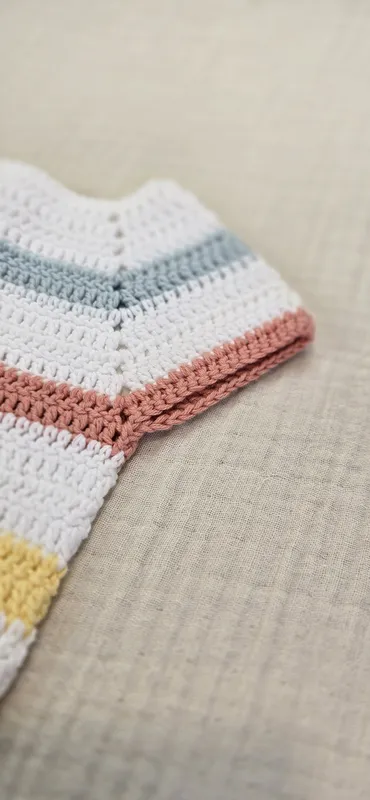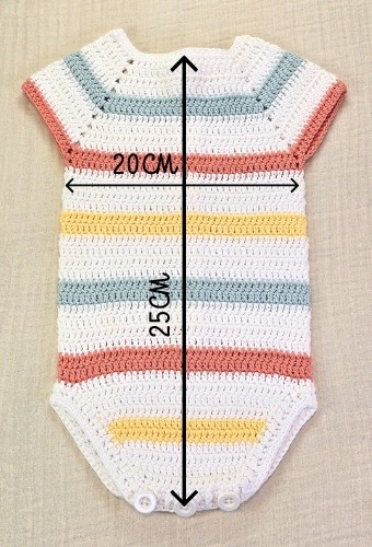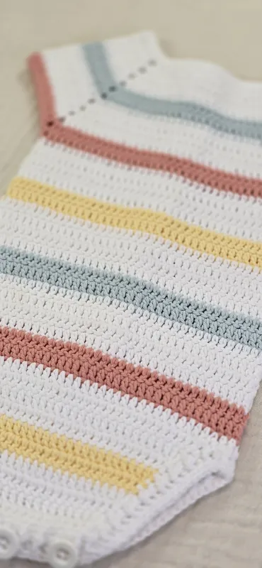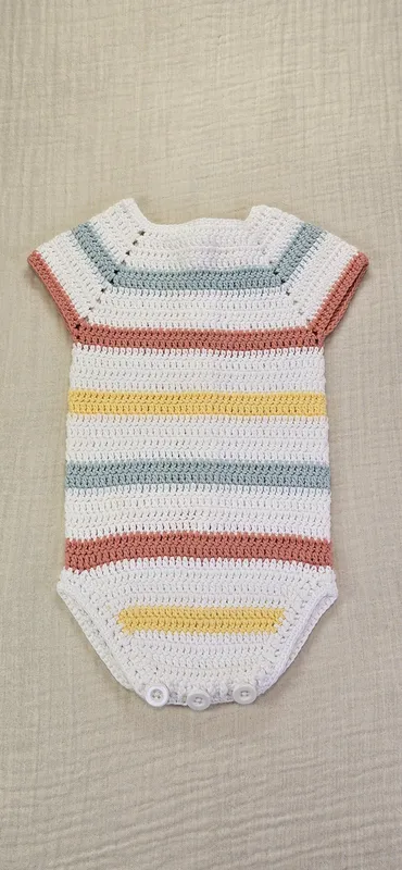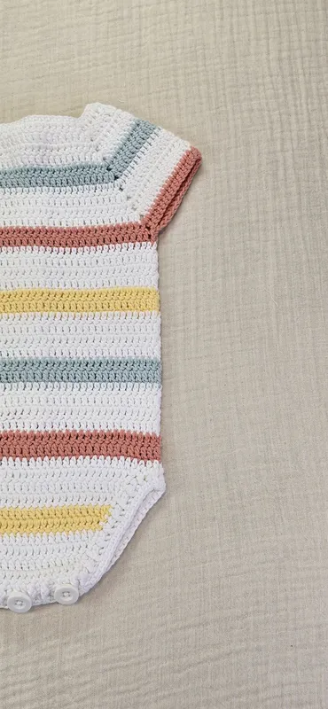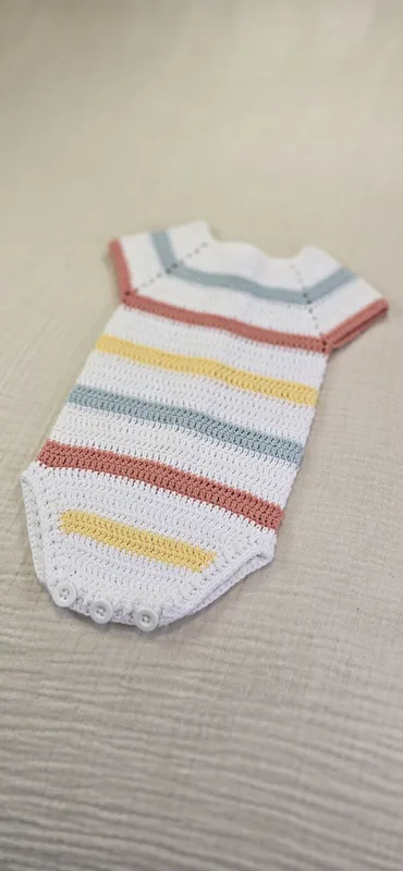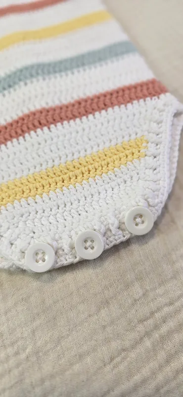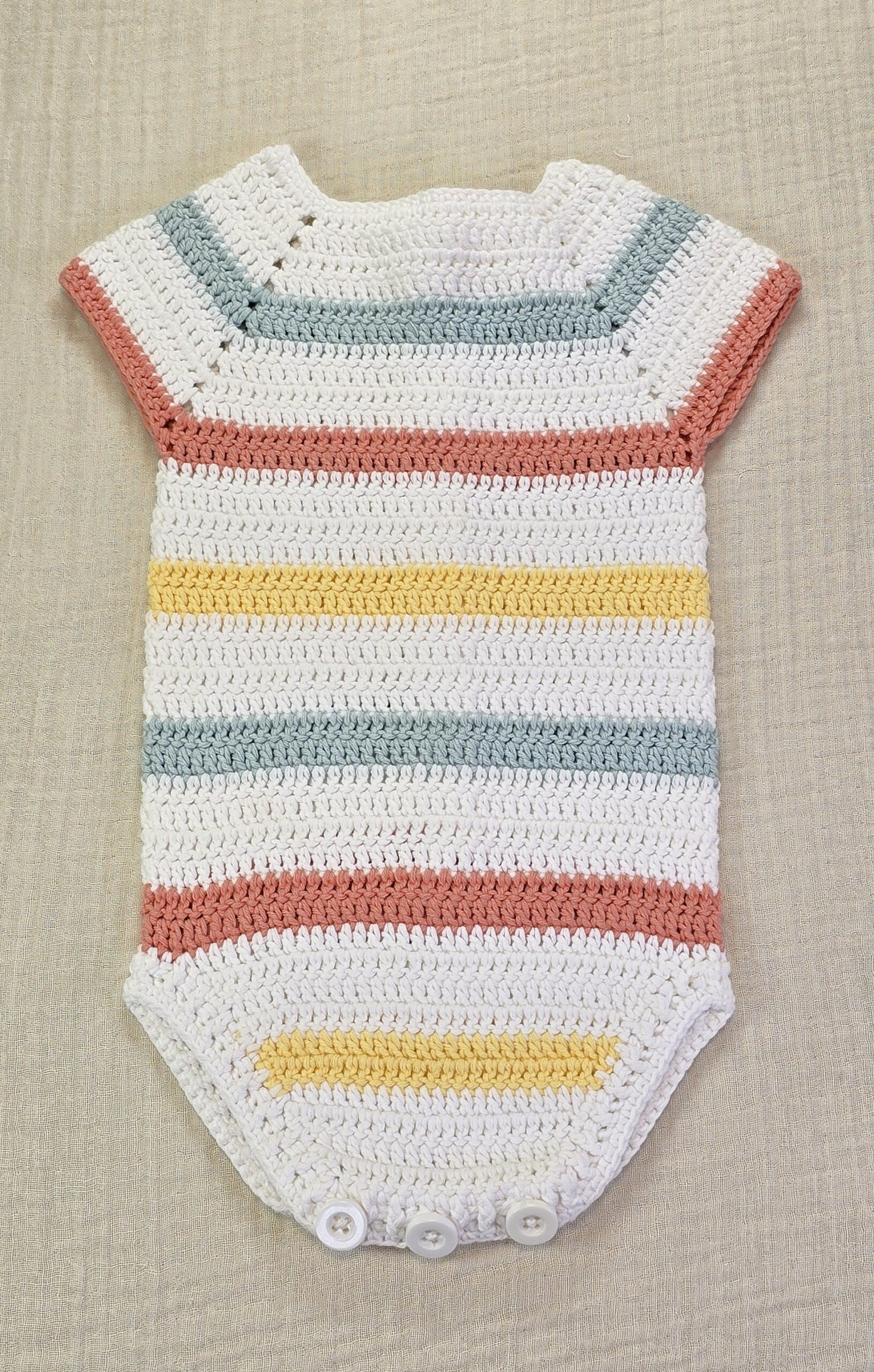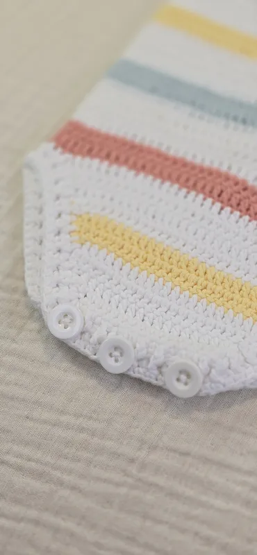 Pelele a crochet, con cierre en la entrepierna y la espalda con botones en madera natural.