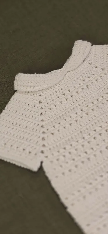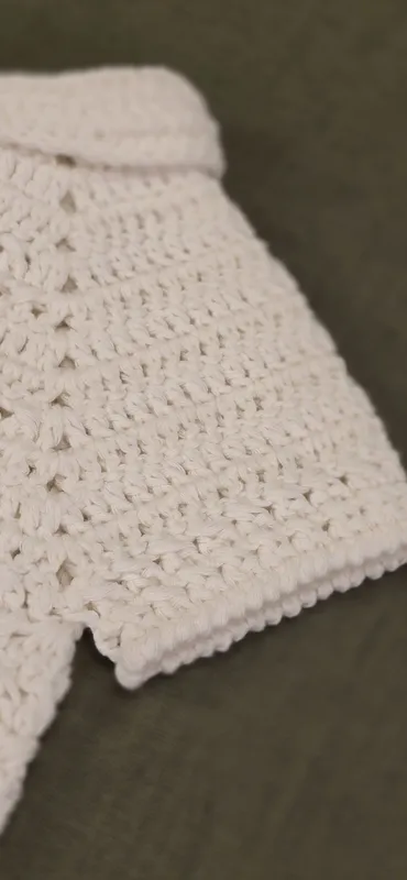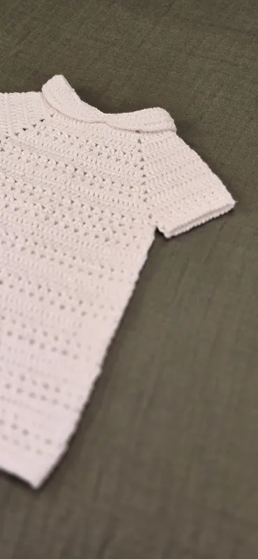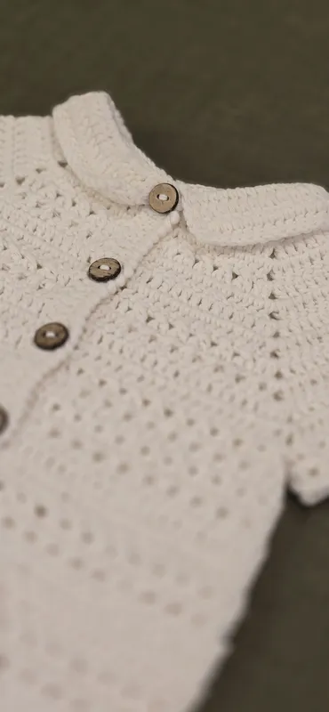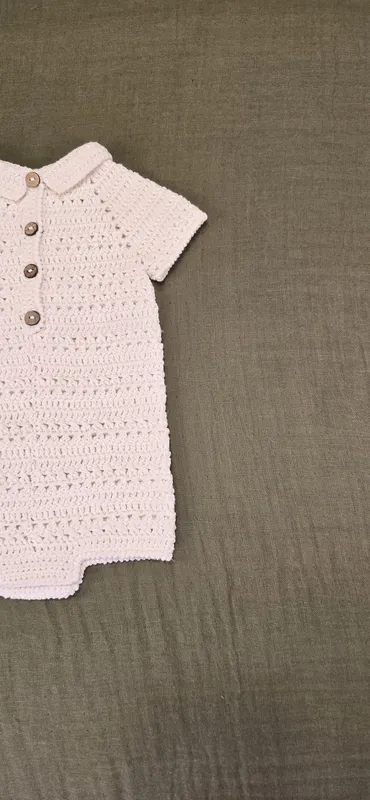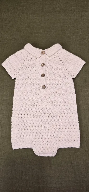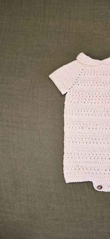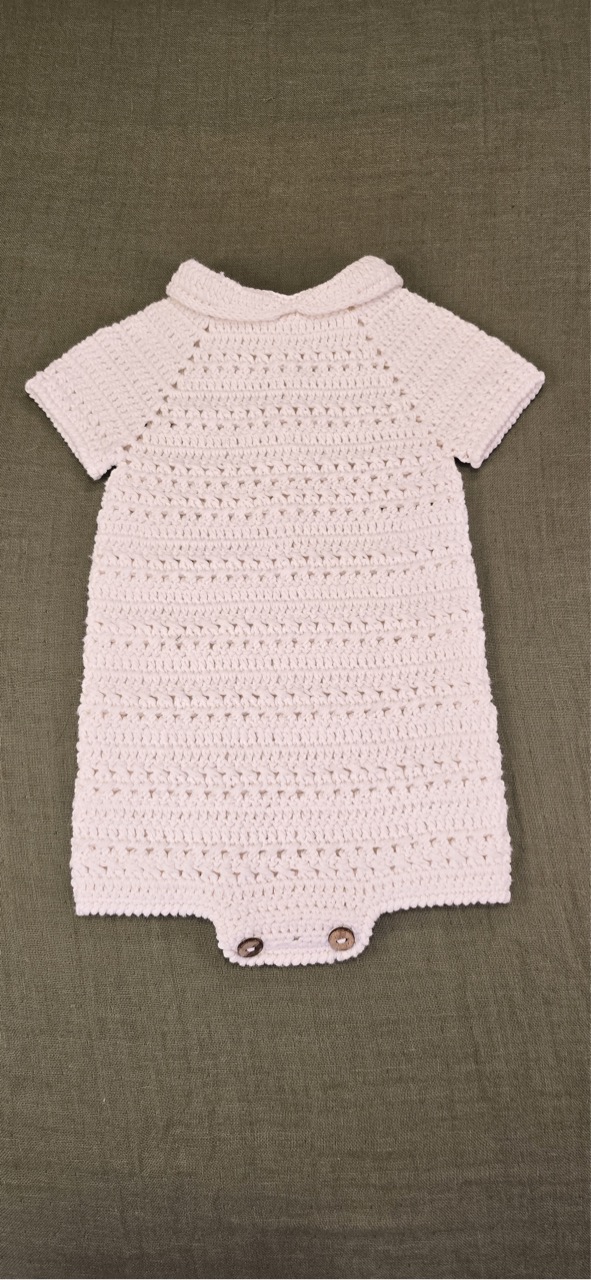 Pelele tejido a crochet, con cierre en la entrepierna y espalda con botones en madera natural.