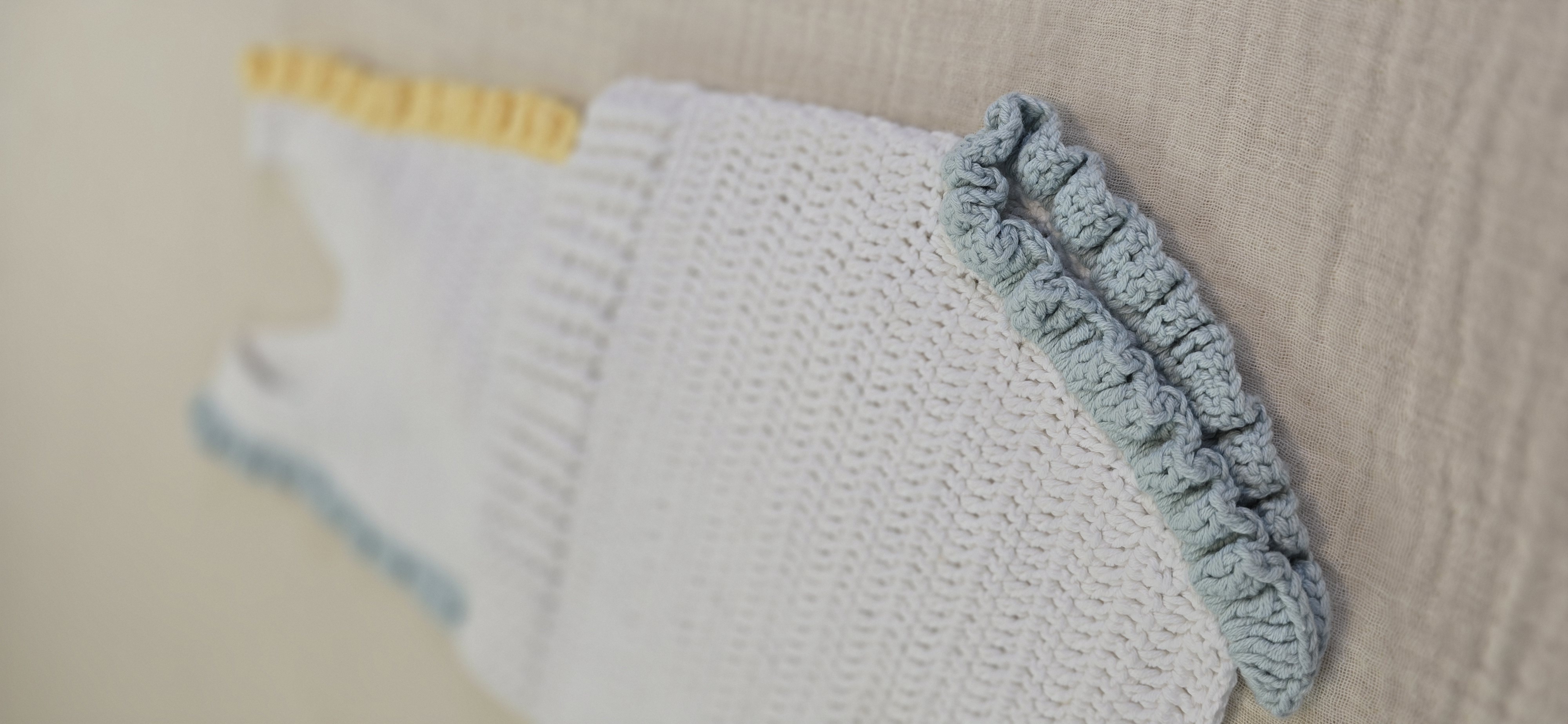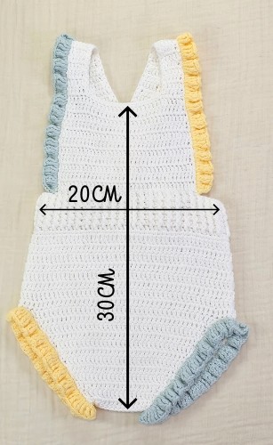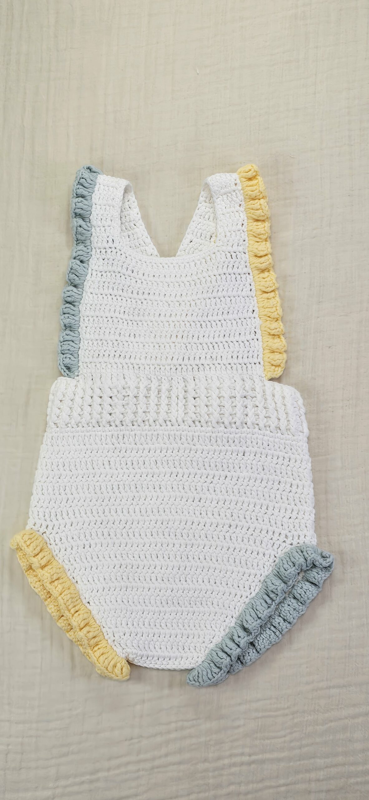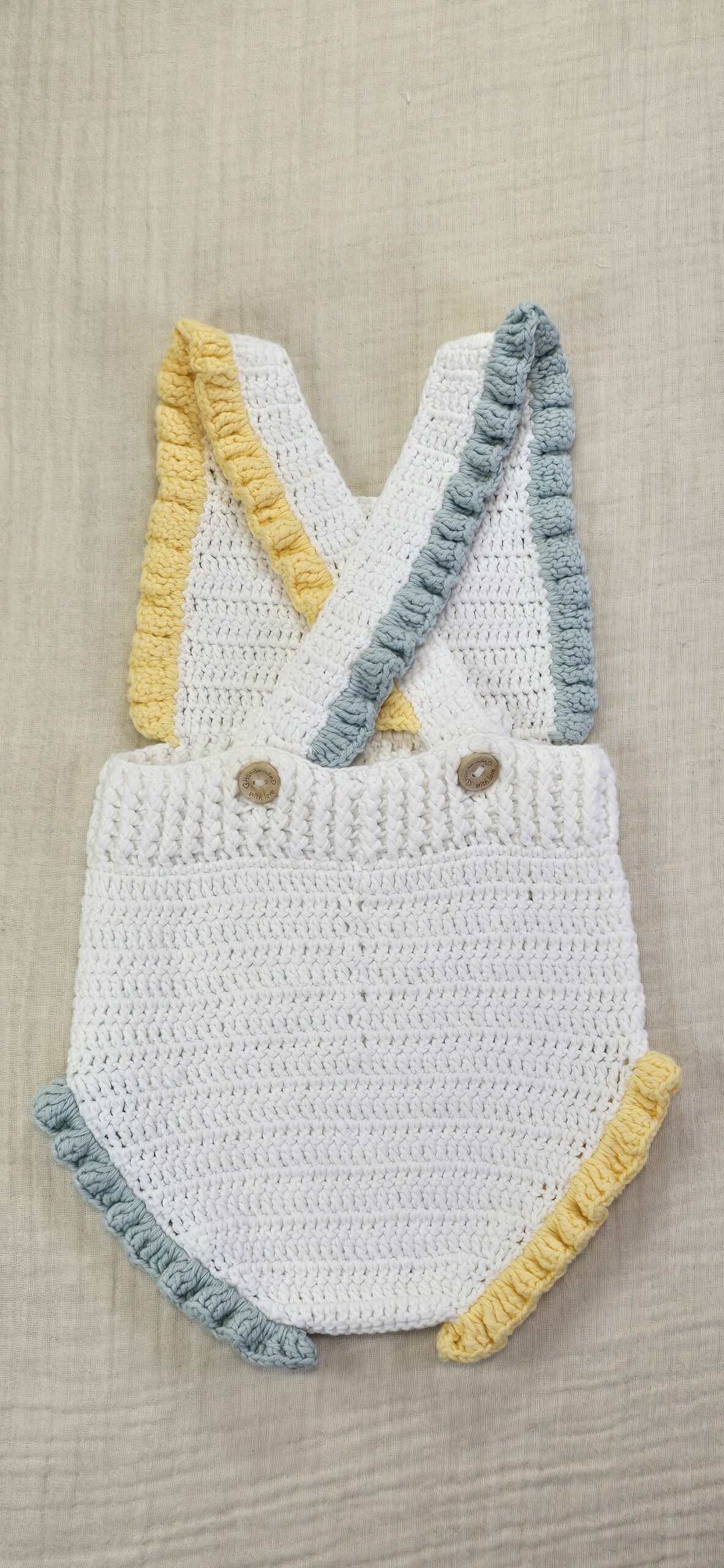 Pelele tejido a crochet, con tirantes a la espalda con botones de madera natural